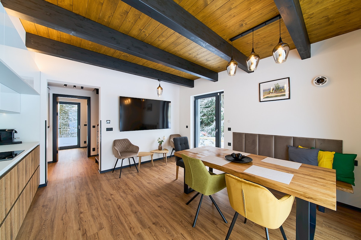 Vítejte v luxusních apartmánech v kouzelném horském městě Horní Blatná, které je součástí světového dědictví UNESCO. Naše apartmány jsou luxusně a vkusně zařízené s důrazem na detail, kvalitu a pohodlí. Poskytují ideální zázemí pro páry, rodiny i skupiny přátel. Pro sportovní vybavení je k dispozici moderní lyžárna a kolárna, včetně vysoušeče lyžařské obuvi, díky kterému Vás každé ráno čekají suché a teplé boty. Samozřejmostí jsou také 4 nabíjecí stanice pro elektromobily.