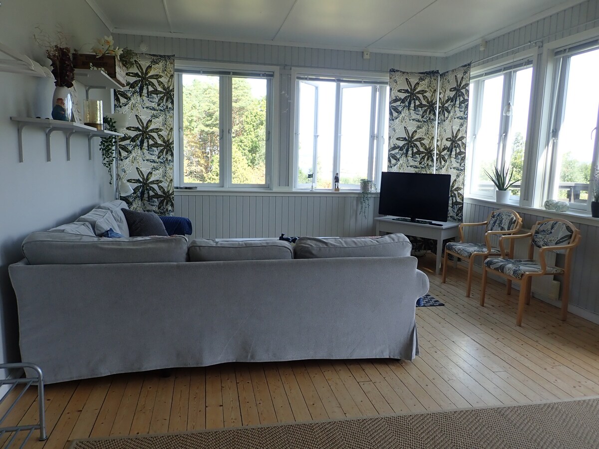 Køkken og stue med 155 cm dages seng og havudsigt. Hovedsoveværelse med 160 cm dobbeltseng. Køkken med ovn/induktionskomfur, køleskab/fryser, service og mikrobølgeovn. Badekar med bruser, vaskemaskine og tørretumbler. Terrasse og stor terrasse med græs. Parkering udenfor. 10 minutters gang til vandet med strande, klipper og bådhavn, skoven 1 minut bag huset. 15 minutter at køre til centrum, 10 minutter til Nordby shopping. 20 minutter til Koster med båd. Roligt område.