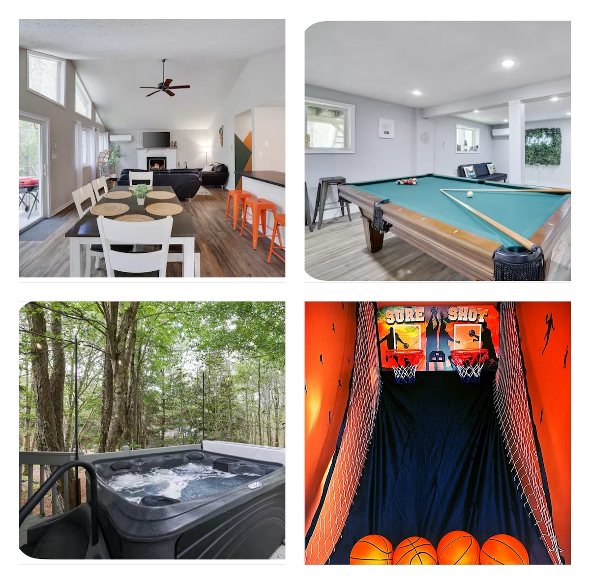 Escape to a cozy fall getaway near Kalahari, Mount Airy Casino, Crossings Outlets, Lake Wallenpaupack, & Tobyhanna State Park 2 miles away w/ fall foliage, & mountain air, lake views, wildlife, & picnic spots. Nestled off a rugged private road. This spa style retreat has a soaking tub, rain shower, smart lights, kitchen w/ smart stove, plush beds, LED mirrors w/ music sync, & retro arcade fun. Perfect for couples, birthday getaways or families seeking a peaceful Poconos stay w/ modern amenities.