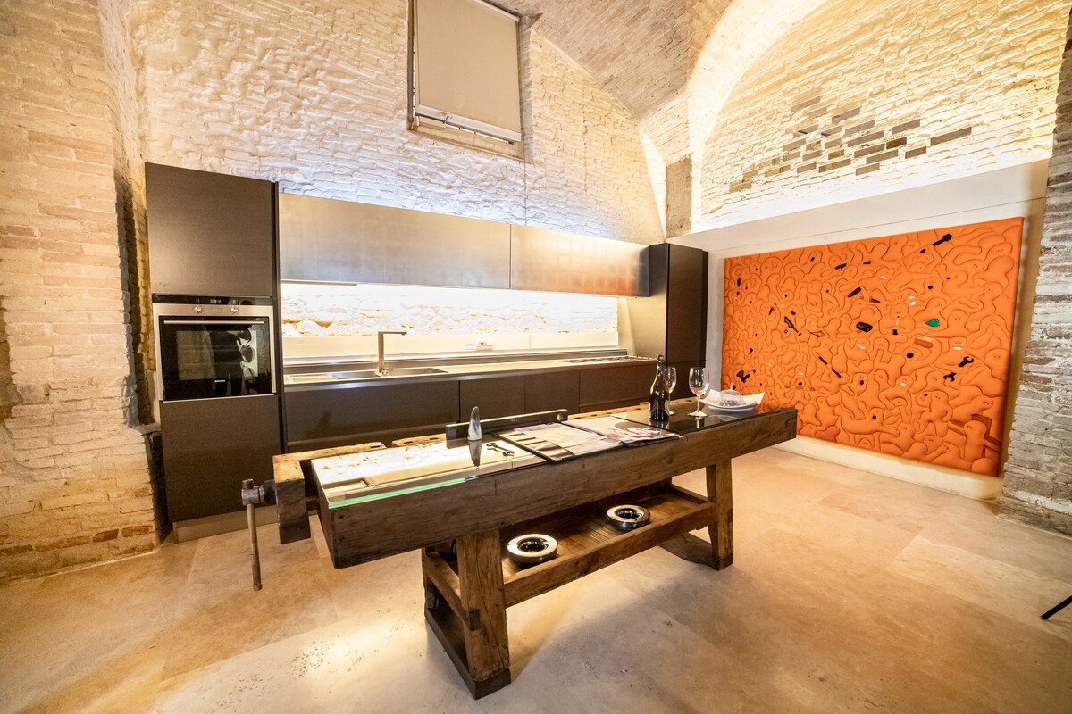 Des Art is an exclusive loft with a private spa in the heart of Perugia, just steps from the Acropolis and Corso Vannucci. Once a Roman structure, then a medieval palace and later a historic carpentry workshop, it’s now a refined retreat blending unique design pieces, contemporary art and total comfort — where history meets modern elegance.