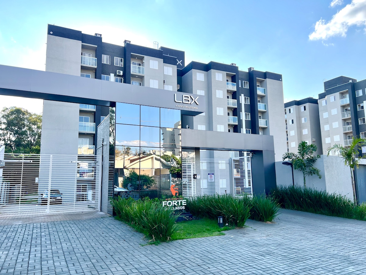 Stay in a modern and cozy apartment just a few minutes from the 2 Municipal Lakes. Residencial Forte dos Lagos, in Toledo/PR, has a complete leisure and work structure in the condominium, including a swimming pool, gym, coworking space, sports court and playground for children. The accommodation has an equipped kitchen, air-conditioned rooms, and for greater comfort the queen-size double bed has a massage function, ideal for relaxing after a day of sightseeing or commitments.