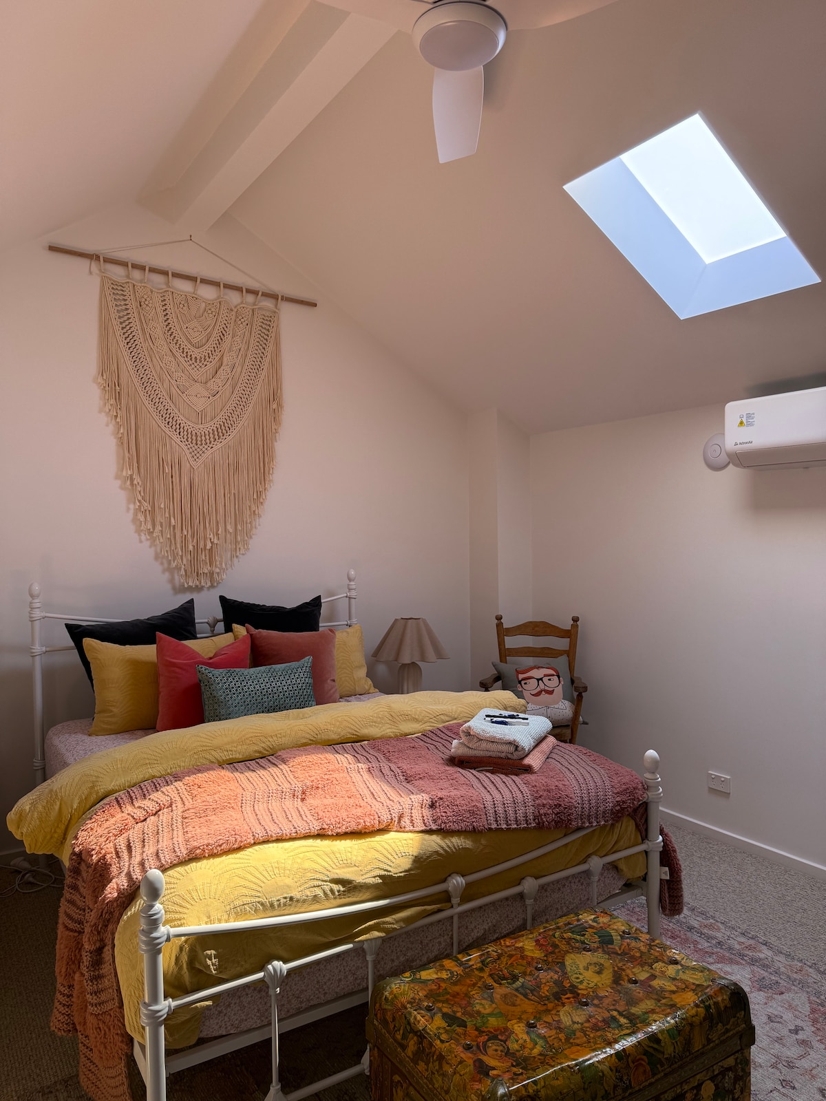 Vores studie er lyst, højt til loftet, rummeligt og roligt med udsigt over en smuk have og omfatter en stue, loftssoveværelse (tilgængeligt via stige) og privat brug. Sengen er queen size og har sengetøj af naturlig fiberkvalitet. Der er et tekøkken med alle de redskaber, du har brug for til at tilberede enkle måltider. En komfortabel sovesofa er tilgængelig i stueetagen (50 dollars i vaskegebyr, hvis begge senge bruges). Enkle ting leveres, herunder te og kaffe.