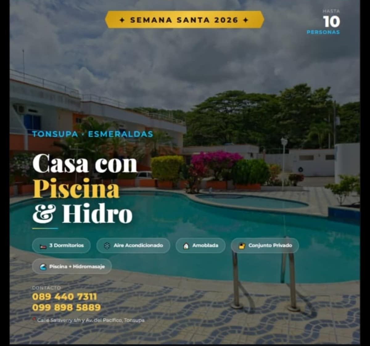 Smukt strandhus til ferie i Tonsupa, Club del Pacifico. Huset ligger i den mest eksklusive del af Tonsupa, en blok fra havet. Perfekt til at tilbringe ferien med alle medlemmer af din familie eller venner, fællesområder som swimmingpool, køkken osv. er til eksklusiv brug for dig, vi har kapacitet til 35 personer.