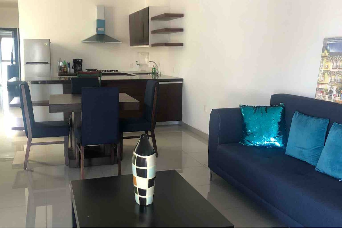 Apt Magnolia (B)—Phenomenal view with a blend of luxury and comfort 5-min drive from Tepatitlan's vibrant downtown. With room for 6, ample space features 2 comfortable beds, a cozy sofa-bed, and high-end amenities like Fiber-Optic Wi-Fi, Smart TVs, kitchen and an in-unit washer and dryer. Nestled in a tranquil, secure neighborhood, you're minutes from iconic attractions like the Centenario market, stores and restaurants. Ideal for families and couples seeking romance and relaxation. Book now!