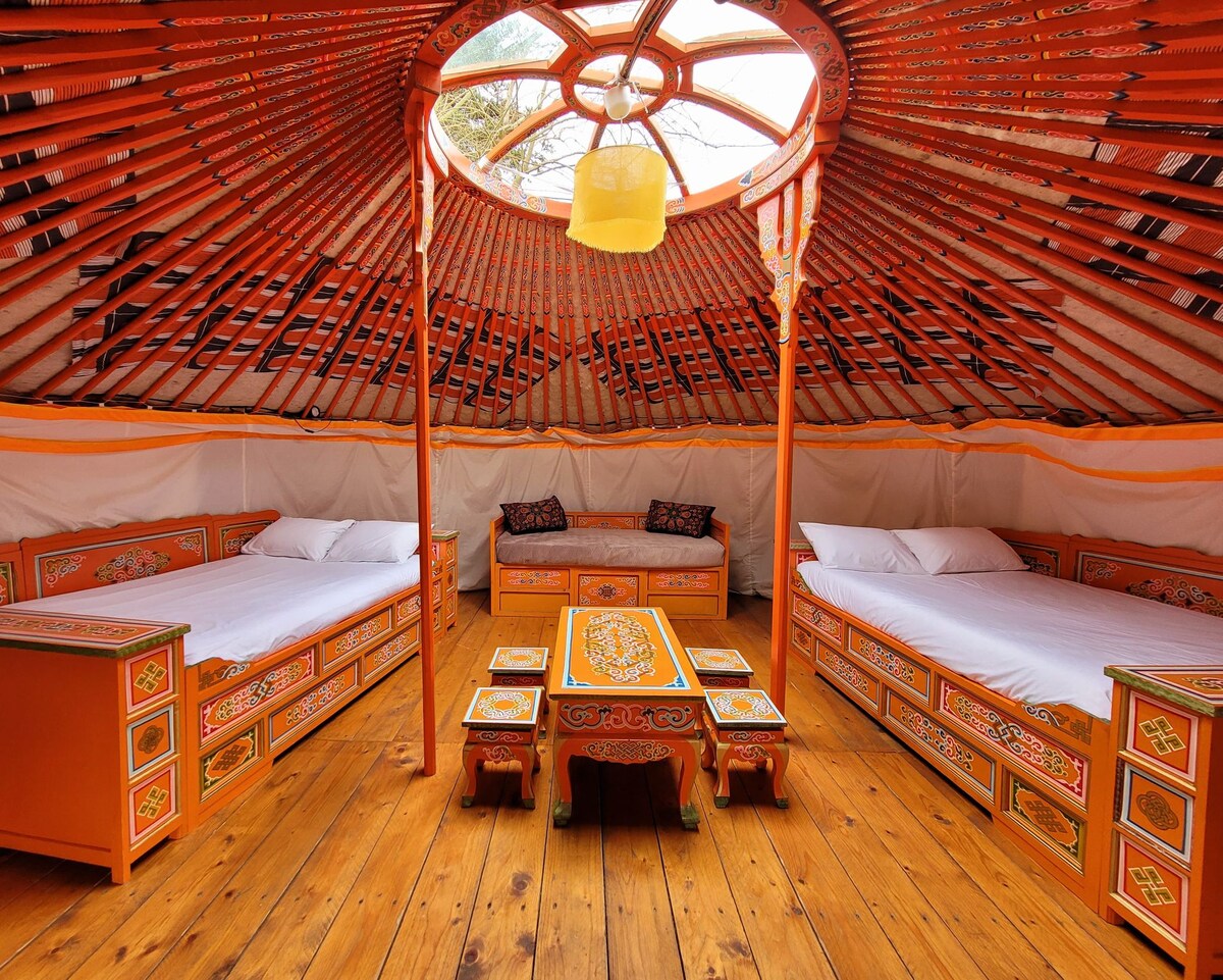 Virginia-jurten med sine orange toner vil byde dig velkommen i en traditionel jurte med alle mongoliske møbler. Op til 5 rejsende • 37 m² bolig i stueetagen med privat terrasse • 2 dobbeltsenge og 1 enkeltseng • Badeværelse og privat udendørs toilet • Inklusiv lækker morgenmad • Sengetøj og håndklæder inkluderet • Privat og gratis parkering på ejendommen • Barneseng til rådighed efter anmodning