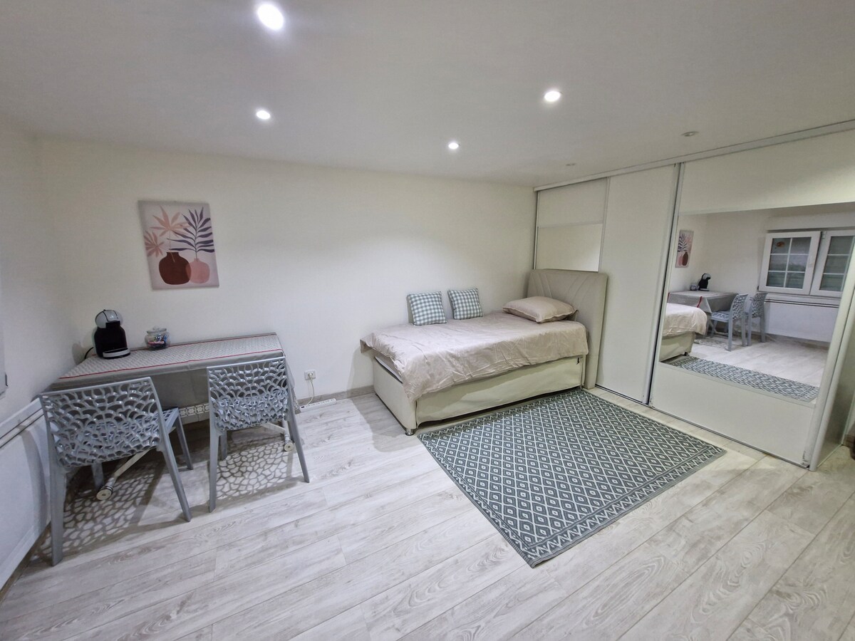 Smagfuldt renoveret atelier, perfekt til to personer, bekvemt beliggende i Tours, tæt på Loire à Vélo/Excelia business school/Esarc (arrangementer) Komfortabel queensize-dobbeltseng 160 cm. Udstyret køkken (køleskab, mikrobølgeovn, kaffemaskine, kedel,service inkluderet). Moderne badeværelse med bruser og toilet (hårtørrer til rådighed) Ryddelig indretning og bohemeagtig stemning. Charmerende privat terrasse Sikker plads til opbevaring af dine cykler og motorcykler Gratis Wi-Fi Roligt nabolag