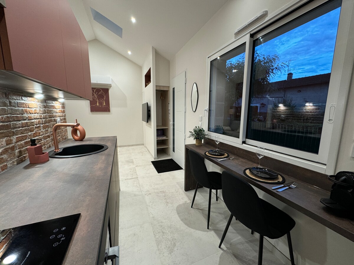 Détendez-vous dans ce logement calme et élégant. Maisonnette neuve de plain-pied de standing située dans une impasse au calme et accessible à pied aux premières commodités (boulangerie, supérette, pharmacie, tabac-presse, pizzeria, coiffeur). Ce logement (type studio) idéale pour deux personnes comprend une pièce principale avec canapé convertible de très bonne qualité (couchage 140x190). Une cuisine équipée et coin repas avec accès sur une terrasse. Une salle d’eau avec un toilette. Un parking