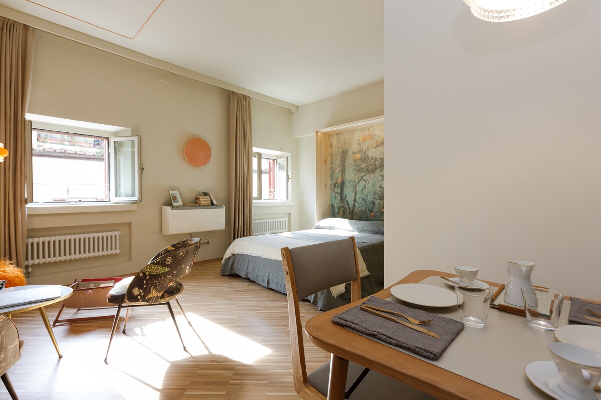 Tag en tidlig morgentur, og nyd Trevi-fontænen uden turisterne. Gå rundt i de historiske gader, mens byen sover, og tag derefter tilbage til en morgenkaffe i denne urbane chic studio med et suspenderet loftsværelse. Dit fantastiske designerloft venter dig i centrum af Rom på en meget stille gade, der er lukket for trafik. Gæster har hele loftet til rådighed. De kan gå til mange seværdigheder såsom historiske steder, restauranter, butikker og offentlig transport.