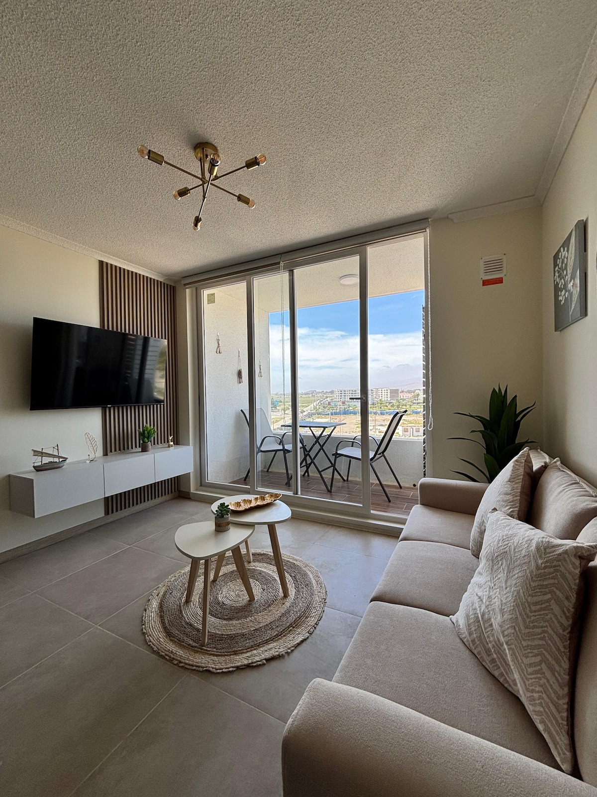 Hermoso departamento, con espectacular vista y ubicado en condominio Gran Marina a pasos de la playa y casino Enjoy. - Habilitado para 5 personas. - Completamente amoblado. - 2 dormitorios. - 2 baños. - Terraza - Tv por cable en dormitorio principal y living. - Internet. - Estacionamiento. - Condominio cuenta con acceso controlado. - Piscina - Quinchos - Amplias áreas verdes y juegos para niños. - Lavandería. - A pasos de la playa. - Junto al casino Enjoy Nota: Toallas no incluidas.