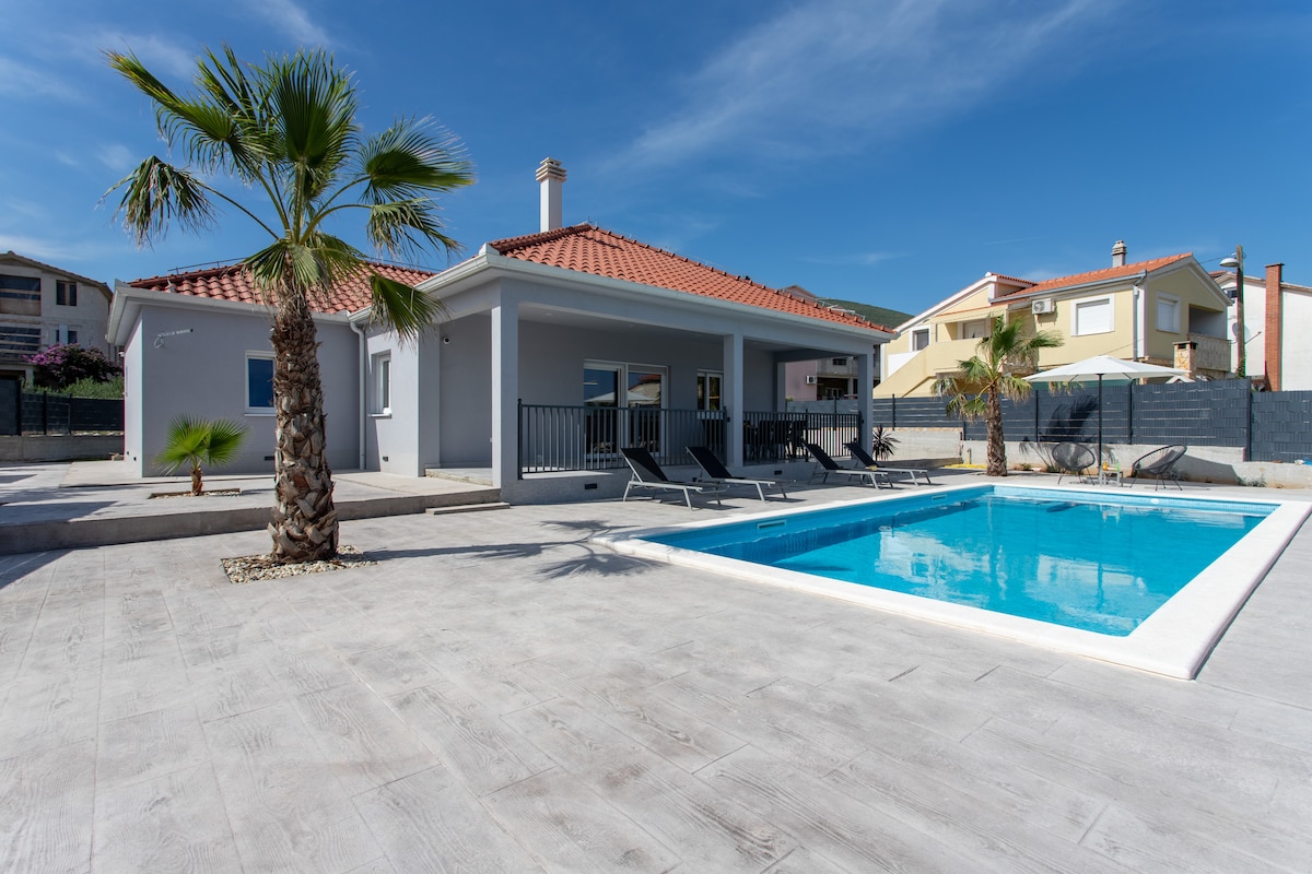 Velkommen til Family Harmony, en komfortabel lejlighed for op til 5 gæster, beliggende i den fredelige landsby Plano, tæt på Split og Trogir. Lejligheden har to soveværelser, et lyst opholdsområde, et fuldt udstyret køkken og et moderne badeværelse. Gæster kan slappe af i den 12,5 m opvarmede pool (ca. 26 °C) med rygmassagedyser, en central gejser og loungestole med luftmassage. Der er også en separat børnebassin (22 cm dyb), hvilket gør den perfekt til familier.