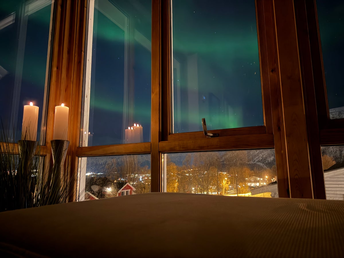 Læn dig tilbage og slap af på dette rolige, stilfulde sted! Stedet er perfekt, hvis du har udlejningsbil,gratis parkering. Hyppige busafgange, der tager dig både til lufthavnen og Tromsø centrum. Du kan tage dine ski på og gå lige ud bag huset og op i ferdi forberedte skiløjper, der også er oplyst, eller gå op ad bjergene for randonee osv. Denne villa har sin egen tagterrasse med en fantastisk udsigt. Denne villa, du udlejer til dig selv,men vi er altid hjælpsomme med hvad du ønsker/behov