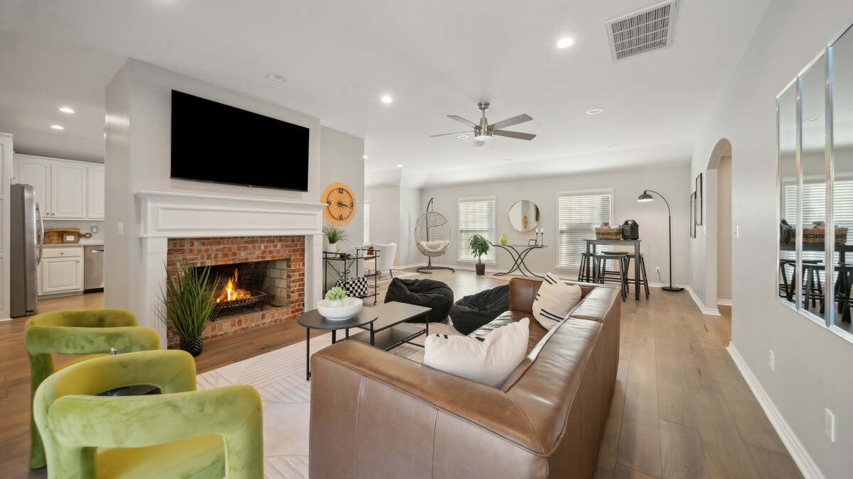 Et par huse fra Midtown's pickleballbaner finder du Ivy Cottage. Charme og karakter er højdepunktet i denne bedårende ejendom. Den store sofa er det perfekte sted at hygge sig og se sit yndlingsprogram på smart-tv'et. Eller server middag i spisestuen med franske døre, der åbner ud til terrassen. Bagved finder du et spabad, smart-tv, sofa, dartbræt, vinkøleskab, cornhole osv. Der venter bløde senge, når du er klar til at kalde det en nat. *Pejsen virker ikke.