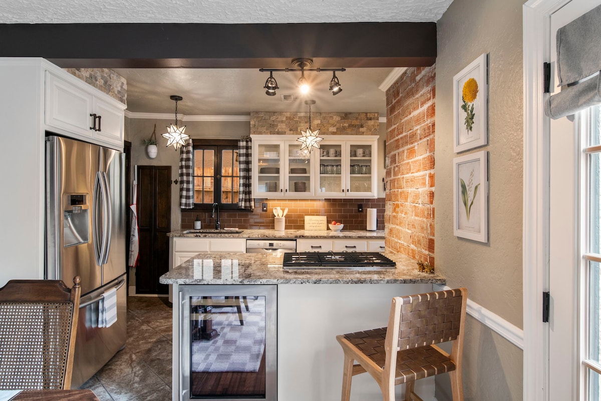 Velkommen til Hurricane House! Beliggende i "øjet" af den gyldne orkan, som er University of Tulsa Campus, rummer boligen 6 personer i 2 soveværelser plus et dedikeret kontorområde med en futon og 1 badeværelse. Mindre end en kilometer fra Rt.66 og tæt på en stor rejseåre, er det tæt på alle de steder, du har lyst til at være i hjertet af Tulsa. Dette fuldt ombyggede hus kan prale af nye møbler og apparater, vaskemaskine og tørretumbler, eklektisk interiør, lokal kunst, levende indendørs planter, fyldt køkken, justerbart skrivebord og overdækket terrasse.
