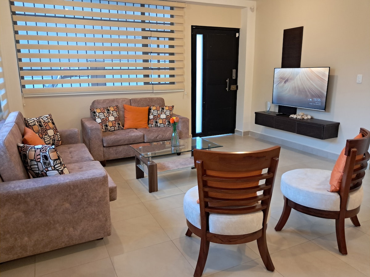 Komplet rummelig og meget lys lejlighed to blokke fra Guaytambos Ave. Den har to soveværelser med store skabe, vinduer til haven og en dobbeltseng i hvert soveværelse. Fuldt udstyret moderne køkken, en vaskemaskine, en stue med et 50'' tv, en privat garage og en uafhængig indgang. Med en privilegeret beliggenhed i Ficoa Las Palmas kan du slappe af på et sted med lidt trafik, meget tæt på markeder, butikker og de steder med den bedste gastronomi i Ambato.