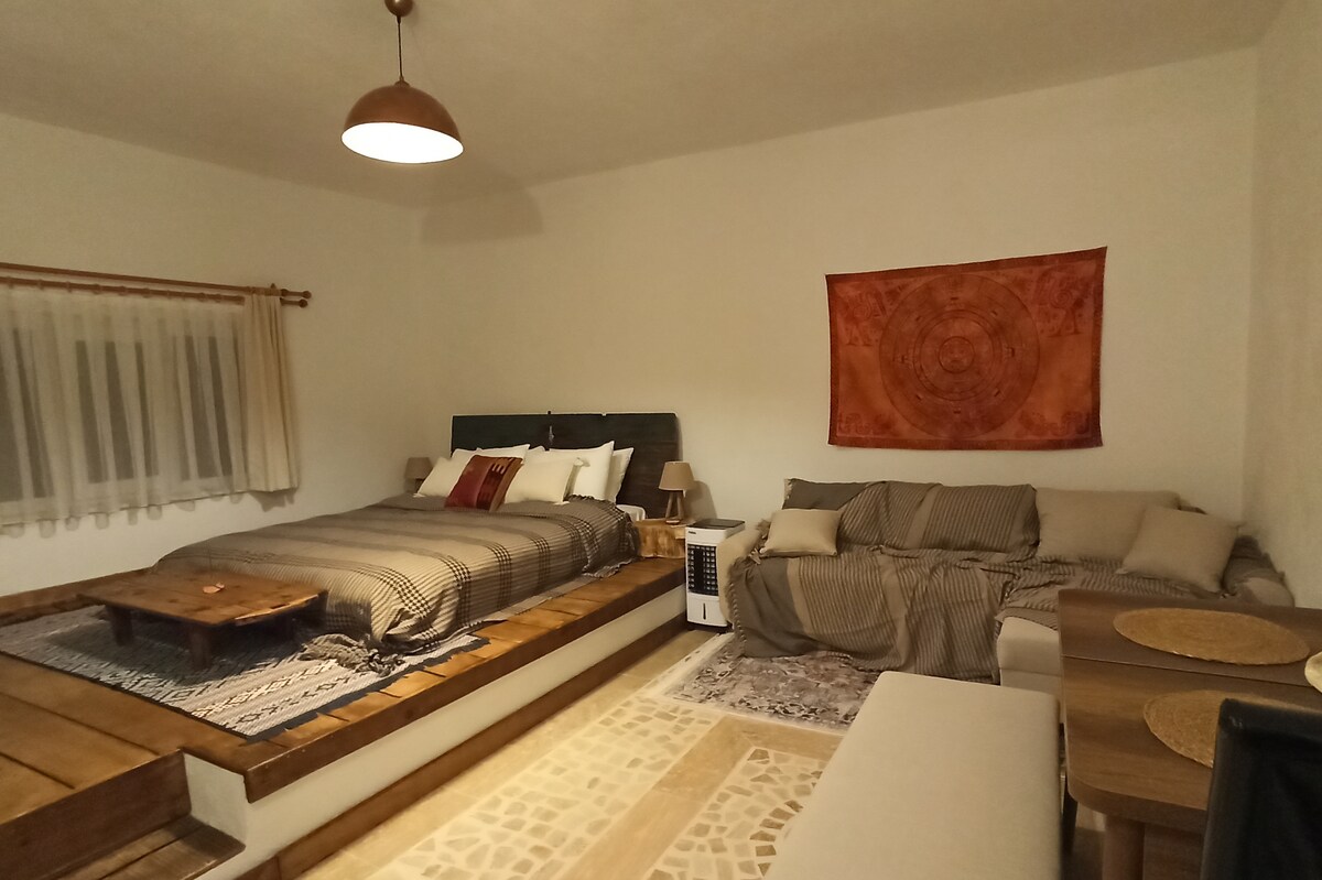 Vores campus ligger i landsbyen Çeşme, 4,5 km fra Datça Palamutbükü Bay, på siden af bjerget og giver en panoramaudsigt over landsbyen og naturen til hvert af husene. Dette hus, der er bygget med naturlige materialer, ligger 1+1 og støder op til et andet hus. Det er arrangeret, så du kan opleve komforten i dit eget hjem med egen gratis indgang, privat lysthus, brusebad-toilet, landsbyovn, køkken og nødvendige ting. Bortset fra dit hjem kan du selvfølgelig drage fordel af de andre fælles faciliteter på campus.