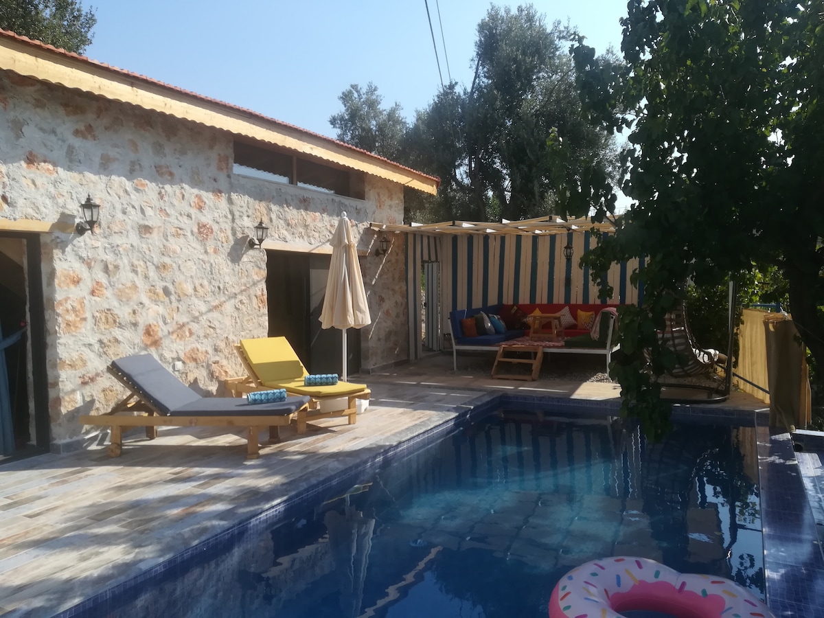Vi blev inspireret af stenarkitekturen i vores villa, der er specielt forberedt til vores gæster, fra Kayaköys historie. Villaen er kun til dig. Det er fritliggende og usynligt udefra. Der er 3 soveværelser og 3 en-suite badeværelser. Villaen er den perfekte villa til vores beskyttede familier. Det er tæt på Gemiler Beach og Oludeniz Beach. Der er en pejs og en grill ved poolen. Alle værelser har aircondition. God jul :)