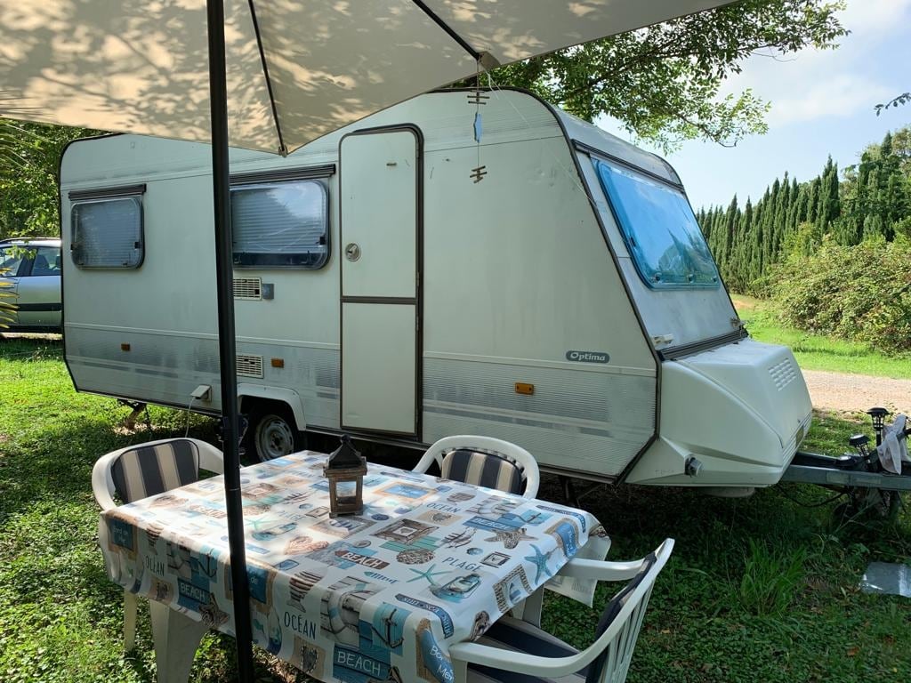 We offer you inside a verdant garden, a caravan with a double bed and a single bed, a large equipped outdoor kitchen under a canopy, bathroom with shower. We provide you also three bicycles, the equipment for the sea. The camping is very close to the stop bus and the train station.