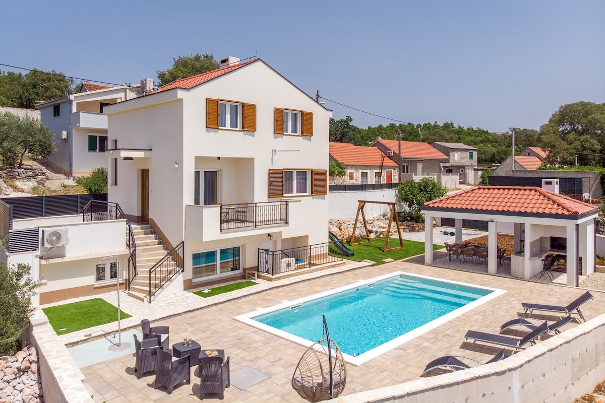 Smuk ferievilla med privat opvarmet pool med spabad i nærheden af Krka Nationalpark. I rolige omgivelser med udsigt over Ivan Meštrovićs mausoleum. Den består af tre soveværelser med dobbeltsenge til 6 personer, køkken med stue, badeværelse og toilet. Huset er fuldt udstyret med alt, hvad der er nødvendigt for at leve. Foran huset er der en solplads med en pool og en pejs, samt et bord og stole til at spise middag i en hyggelig aftenstemning med fuld privatliv. Bag huset er der en parkeringsplads til 4 biler