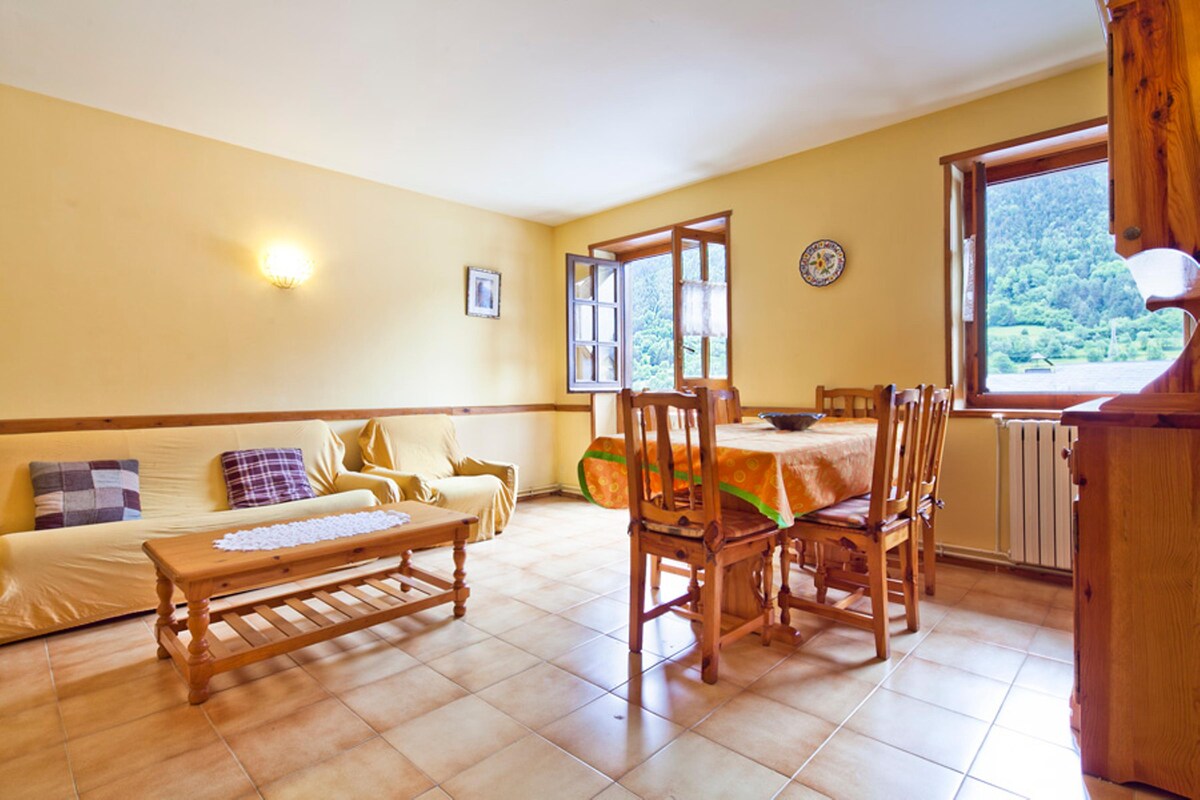 Duplex lejlighed (højre) Gratis WIFI. To soveværelser (maks. 5 personer), komplet badeværelse, stue med fuldt udstyret tekøkken. Sengetøj, Norden og håndklæder er inkluderet. SPEKTAKULÆR UDSIGT. All apartments in which the house is divided, have free access to the private Terrace-Mirador of the accommodation. Parker foran huset. 3 km fra Vielha og 15 km fra Baqueira. Vi har to meget lignende lejligheder (Dreta i Esquerra), mellem de to har plads til 10 personer.