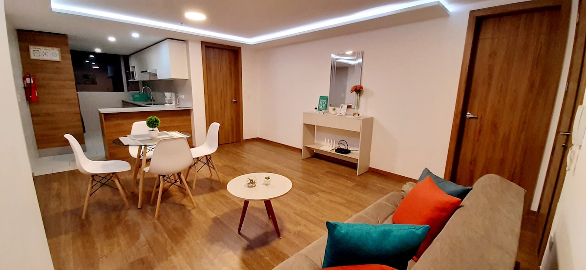 Moderne loftslejlighed på 21. etage, ny bygning med selvstændig generator, ideel til forretningsrejser eller til en særlig lejlighed, unik udsigt over byen. Privilegeret beliggenhed i det nordlige centrum af Quito ved siden af La Carolina Park, og kun få skridt væk finder du indkøbscentre og finansielle institutioner. Servicen inkluderer parkering, wifi, hjemmebiograf, badekar, varmt vand, fælles vaskemaskine/tørretumbler, hygiejneartikler, fitnesscenter og swimmingpool.