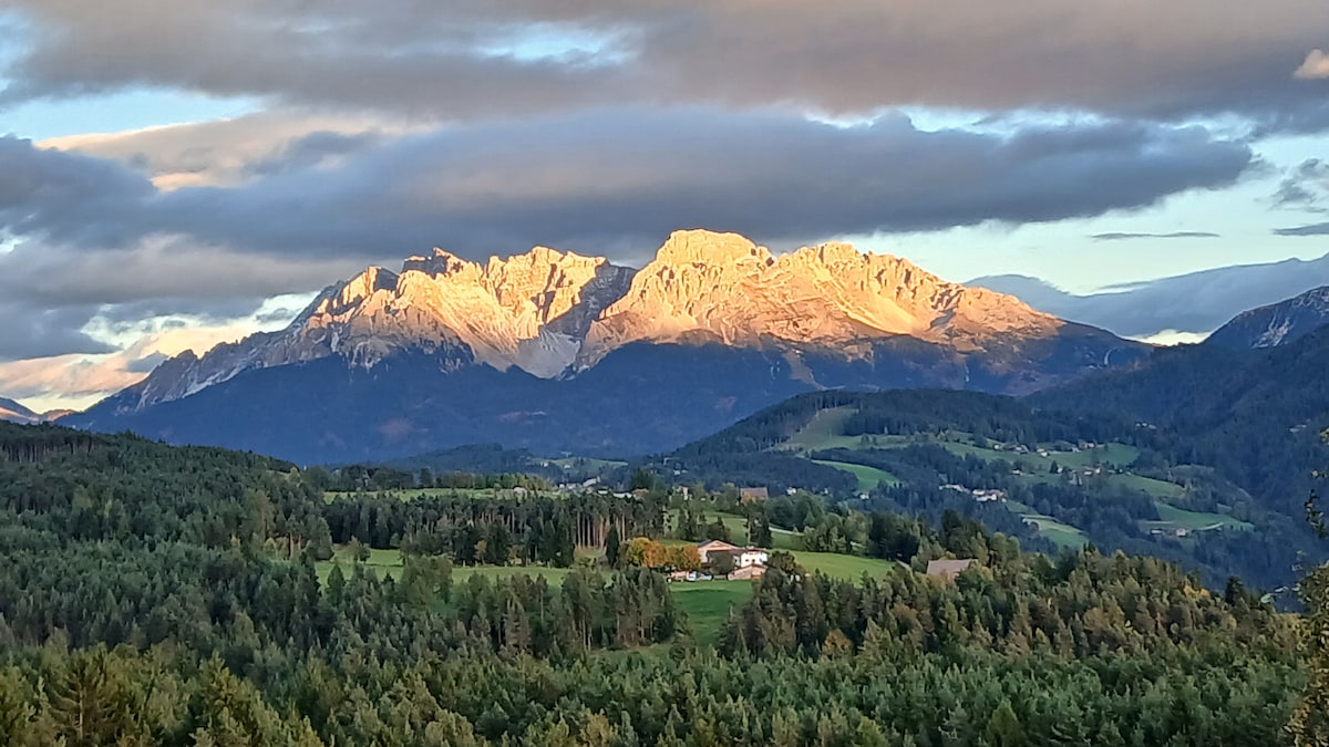 Rummelig lejlighed til fire personer, væk fra hverdagens stress. Samlet udsigt over de sydtyrolske Dolomitter.