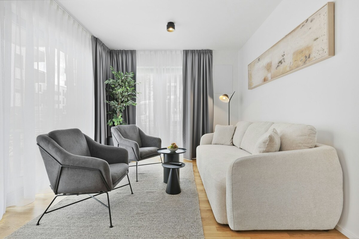 Se frem til en stilfuld nybygd lejlighed med et separat soveværelse med en komfortabel dobbeltseng. Som ekstra soveplads er der en sovesofa i den åbne stue. Det moderne badeværelse med bruser i gulvniveau har en hotellignende atmosfære, mens det fuldt udstyrede køkken med spiseplads sikrer, at du føler dig hjemme.