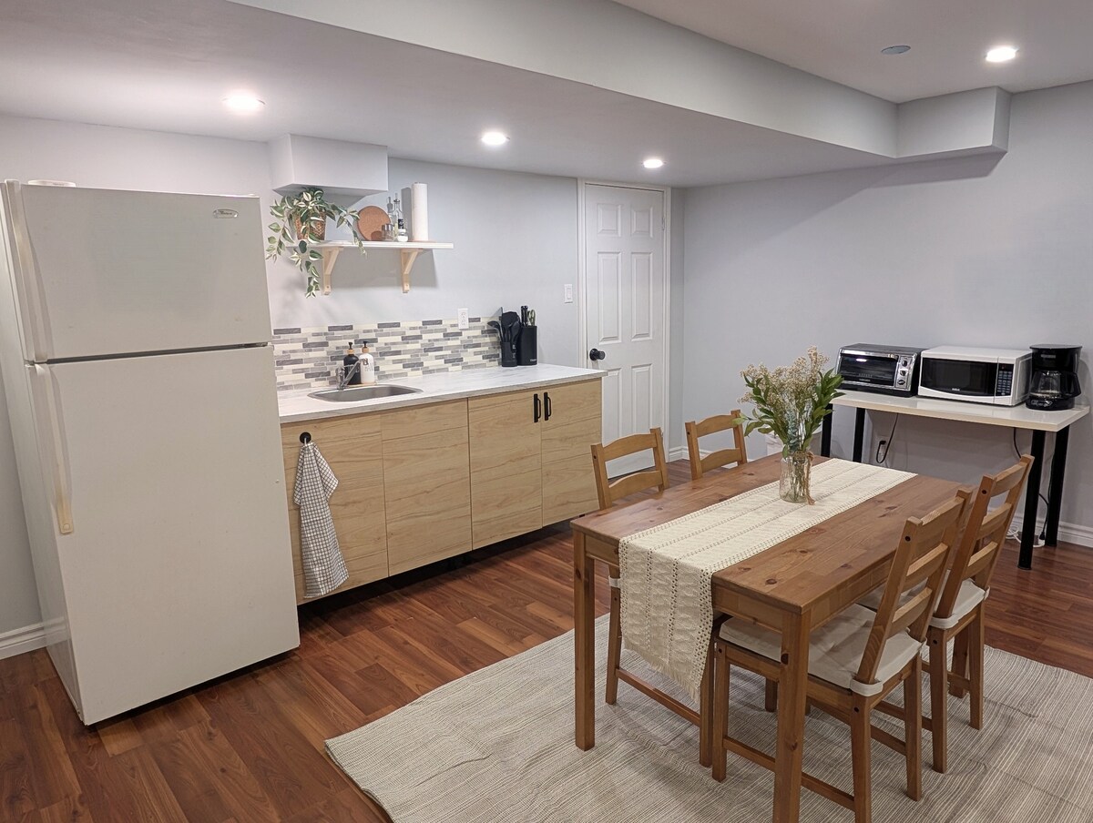 Kom og nyd vores private, rummelige og lyse gæstesuite med 1 soveværelse beliggende i West Barrie. Nyd den private indgang og hele kælderenheden. Gangafstand til Ardagh Bluffs, stier og busstoppested. 10 min kørsel til HWY 400, shoppingområder og Lake Simcoe. 15 min kørsel til Snow Valley Ski Resort. - Gratis parkeringsplads - Gratis 200 mbps Wi-Fi - Egen indgang Tekøkken, køleskab/fryser, komfur/ovn, mikrobølgeovn, brødrister, opvaskemaskine, vaskemaskine, strygejern, skabe - Rygning forbudt - Ingen kæledyr