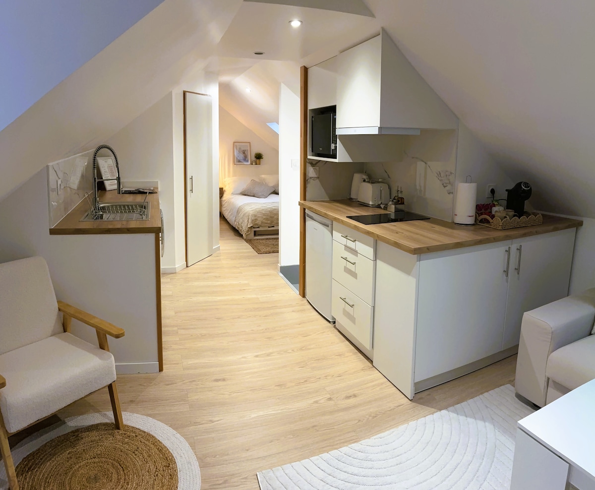Renoveret duplex, der støder op til gæstehuset, med en storslået jomfruelig vin på facaden, herunder: - et fuldt udstyret køkken til 2 personer (Nespresso, Tassimo og filterkaffemaskine til rådighed) - et soveværelse med en 140 dobbeltseng og en fast sofa (ikke konvertibel), et skrivebordsområde og tv. - et badeværelse med badekar og bruser. Tæt på alle butikker (gåafstand): bar/tobak, købmand, bageri, supermarked, restauranter, biograf, bowling.