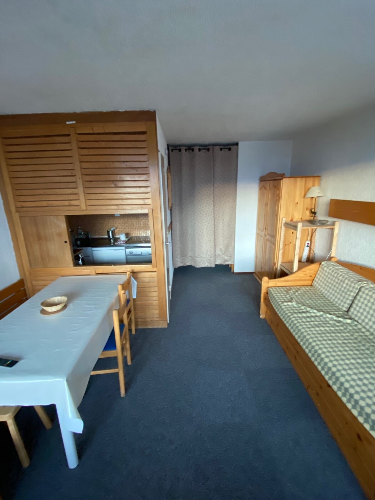 NY LEJLIGHED I VAL THORENS! Center Station, Ski til fods, Skiopbevaring, Afgang på ski, Retur på ski Charmerende lille studie på 18 m2, meget veludstyret. -Køkken: opvaskemaskine, ovn, mikrobølgeovn, kedel, stort køleskab, emhætte, induktionskogeplade. -Stue: sovesofa med dobbelt madras (160 cm), wifi, smartTV, IP TV Résidence la Roche Blanche 50 m fra Place Caron. Medbring sengetøj og håndklæder.