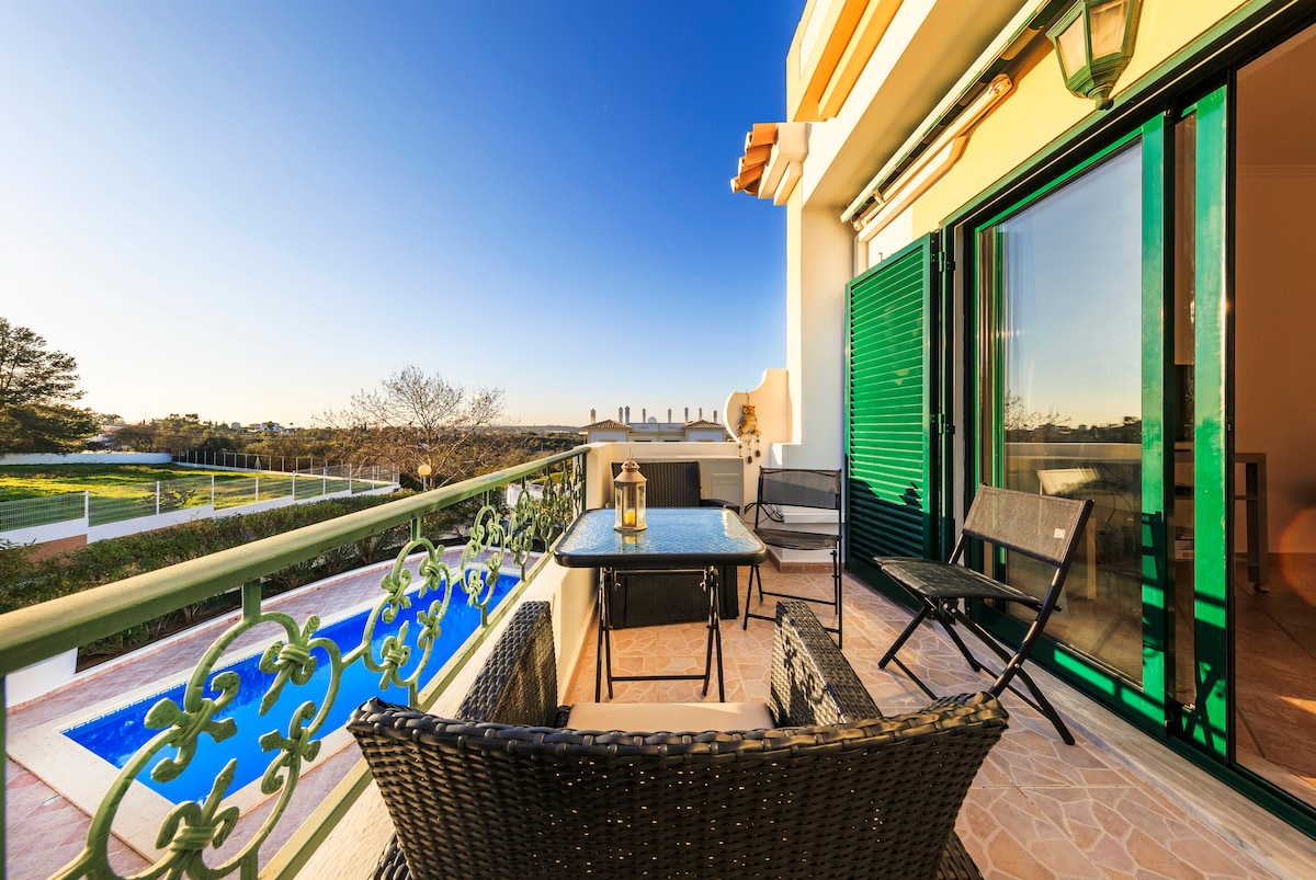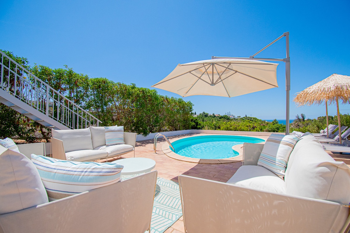 En fuldt møbleret lejlighed tæt på havet. Har et varmt udseende med smukke detaljer. Beliggende på første sal (op til 55 m2). Med et dobbelt soveværelse / stort badeværelse / smukt stue med tv. og åbent køkken. Villaen ligger i en smuk dal og kun 2,4 km fra Marinha stranden og 3 km fra Benagil med den berømte grotte. Supermarkeder og den hyggelige by Carvoeiro ligger 7 minutters kørsel væk På grund af roen på vores område er minimumsalderen 15 år.