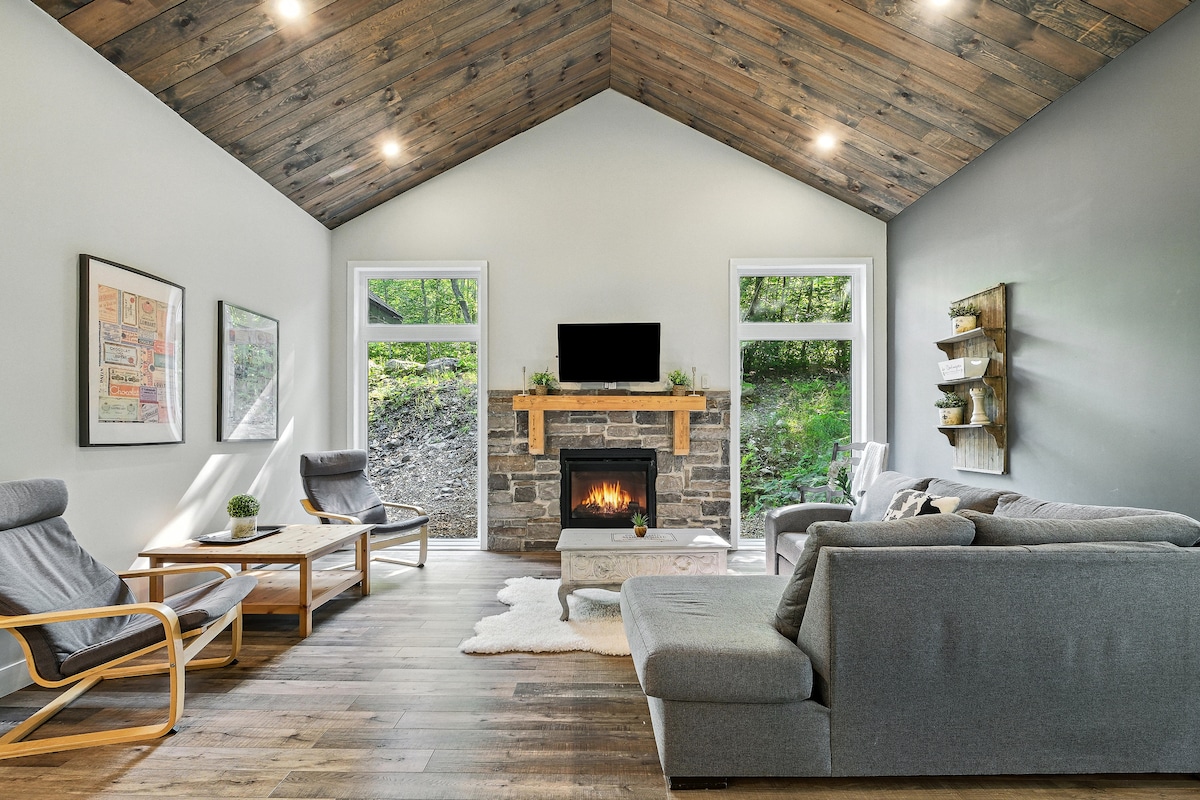 *$* VINTERKAMPAGNE *$* For en weekendreservation (fre. & lørdag) den 3. nat søndag er 90,00 dollars!. Monumentalt åbent koncept, midt i naturen. Adgang til stier direkte bag huset. Brændeovn, stort moderne badeværelse, et soveværelse + sovesofa. Endnu en sovesofa i stuen. Ideel hytte til et par med børn eller to par. Vilde fugle, kalkuner og hjortelskere er velkomne! Wi-fi og oplader til elbiler inkluderet. Hunde er velkomne! CITQ : #308038