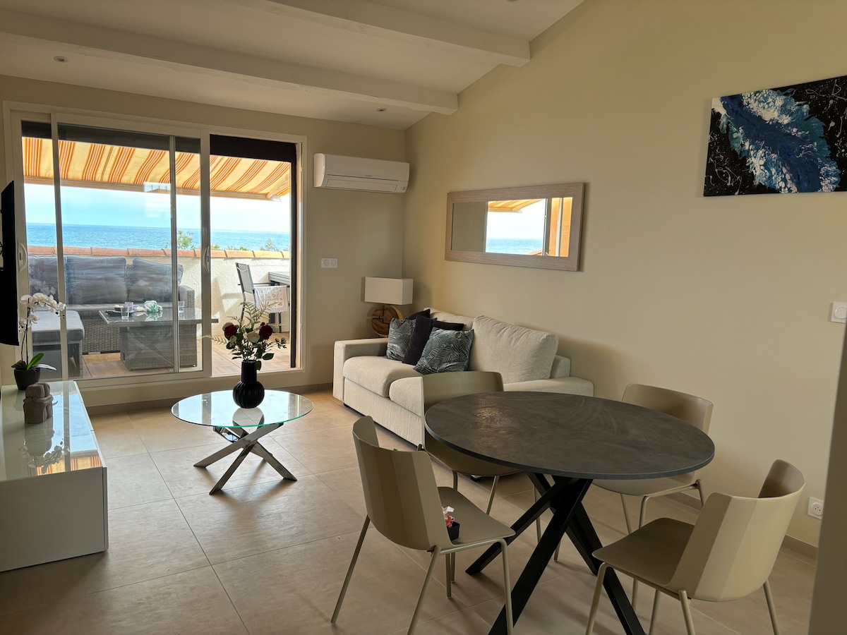 Enestående og uhindret havudsigt fra balkonen, stuen og soveværelset. Perfekt beliggenhed: 15 meter fra stranden og 3 minutters gang fra byens centrum. Vinkel lejlighed, på anden og sidste sal (uden elevator) fuldstændig renoveret. Fiber-WiFi, internet-tv (280 kanaler, Netflix-adgang med dit abonnement, gratis film og serier på OQEE) kvalitetsseng (140 cm seng i soveværelset). Vaskemaskine. Privat parkering sikret med en port. Sengetøj og håndklæder valgfrit (25 €)