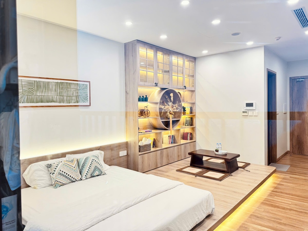 Experience living in this modern 75m² two-bedroom apartment featuring a panoramic lake view, a luxurious bathtub, and a private sauna room. Located in Landmark 1 – Ecopark, the apartment enjoys an unobstructed high-floor view directly overlooking the iconic Swan Lake Central Park, bringing nature right to your window. Just steps away is the Mori Onsen, where guests can indulge in authentic Japanese hot-spring and spa experiences. This is a perfect retreat and a premium lakeside stay.