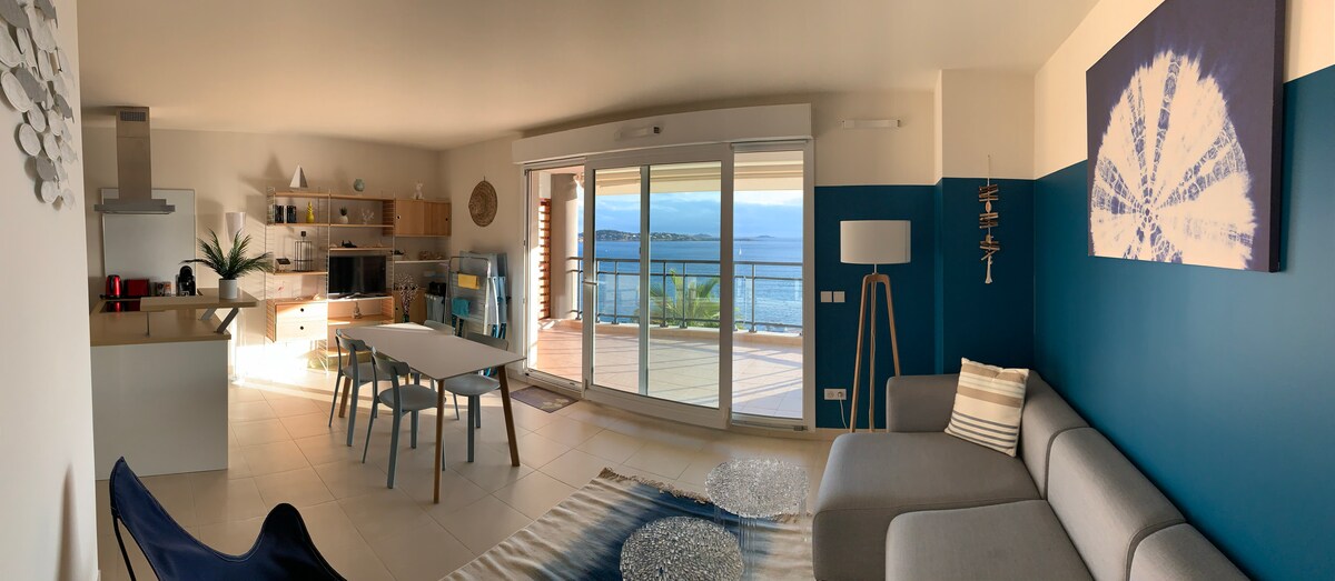 Renoveret lejlighed på den smukke og lange strand La Bergerie Med udsigt over havet, med fødderne i vandet, direkte på stranden, byder Sabine og Sébastien dig velkommen i deres smukke moderne kokon. En sand oase for elskere af havet, du vil ikke kunne tage øjnene fra det, og du kan nyde solopgangen over de gyldne øer fra din seng. Hyggelig og varm atmosfære, lejligheden og dens terrasse på 27 m2 ligger i enden af boligen for mere privatliv.