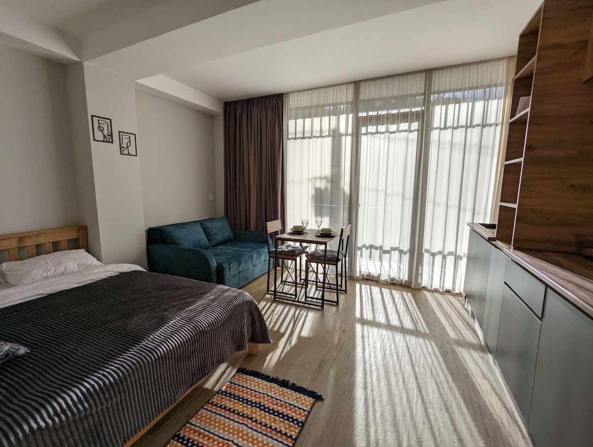 Du har nem adgang til alt fra centralt beliggende 4-stjernet hotel. Lige i nærheden er der dejlige parker, skovzone til frisk luft, og det er 3 minutters gang fra vinteren den bedste vinter olympiske 2023 skisested Didveli med svævebaner. 40sq.m lejlighed er Studio-stil med en stor balkon. Sengene har sengetøj, håndklæder, der er alle nødvendige tallerkener og en brødrister, kedel, vaskemaskine. Lejligheden ligger på 4. sal med en perfekt udsigt. Poolen er ude af drift midlertidigt.