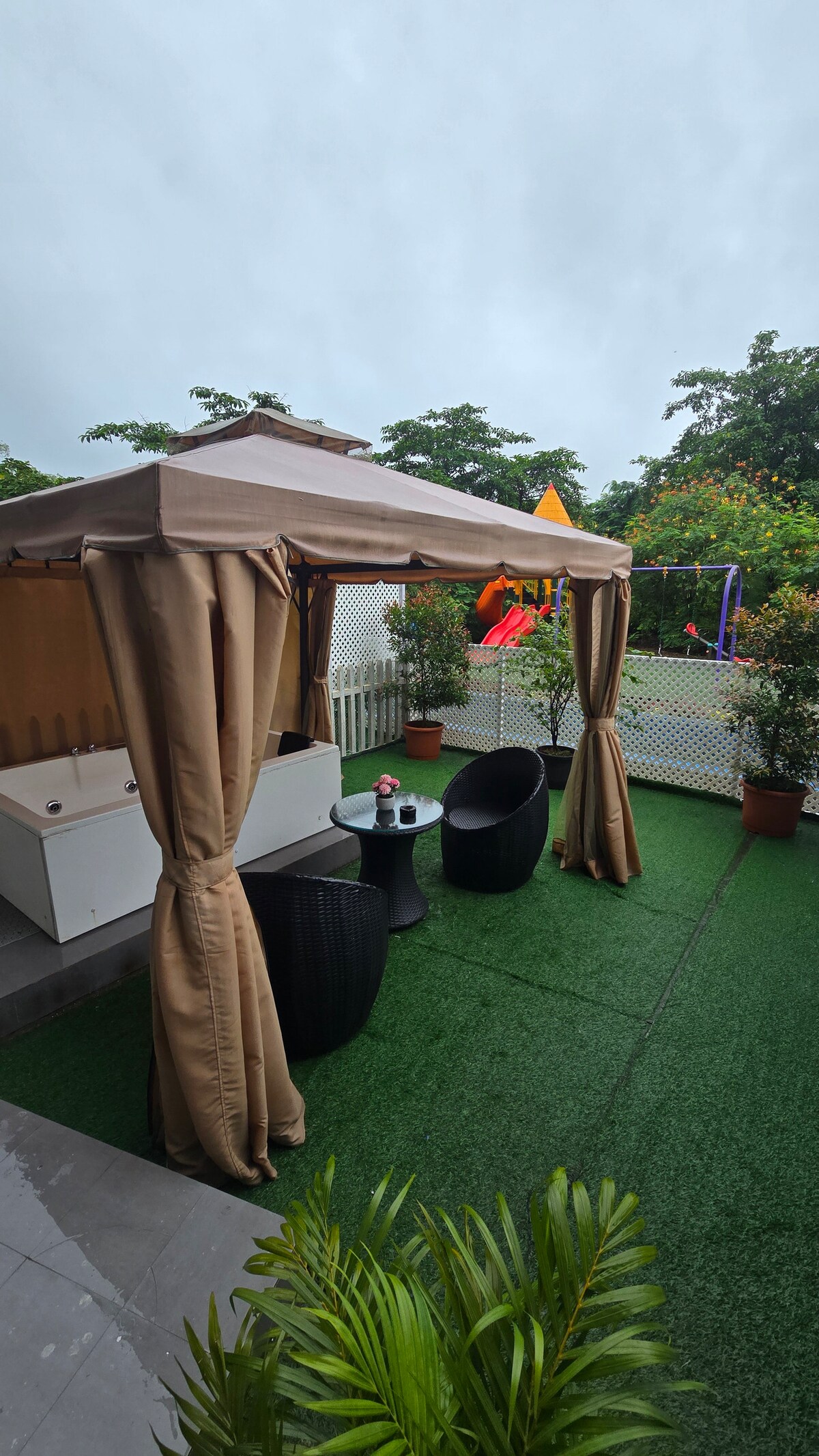 Boho Style Luxury Studio med jacuzzi og have. En fredelig smuttur. Fuldt fyldt med WiFi, JBL 2.1 Home Theatre, BT Music System, Full-HD LED-tv. Et stilfuldt badeværelse med toiletartikler. Spiskammer med te/kaffe, RO-vand, mikrobølgeovn, induktionskomfur, køleskab og med brødrister. Indhegnet have til børn. Spis i haven med smukt vejr. Jacuzzi har varmt vand, der kan bruges når som helst. Fælles faciliteter på stedet såsom swimmingpool, spilrum, fitnesscenter, miniteater, cykling og restaurant.