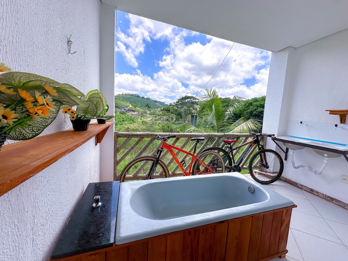Slap af og afbryd forbindelsen i denne charmerende lejlighed, der ligger inde i en kaffefarm, kun 15 km fra centrum af Caratinga, med nem adgang med BR. Boligen er ideel til par, familier eller små grupper og har plads til op til 4 personer i komfort og tilbyder et soveværelse med dobbeltseng og en bicama. Altanen er højdepunktet: et badekar med udsigt over naturen inviterer til hvile og særlige øjeblikke. Gården er en invitation til ro med landskaber, der inspirerer til ro og velvære.