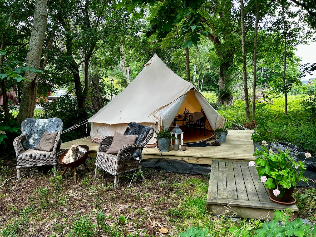 Her bor du centralt i Onsala med nærhed til havet, skoven, landet og byen Göteborg. Du bor i et glampingtelt i skoven med adgang til badeværelse og tekøkken. Teltet har to enkeltsenge med behagelige dyner og puder. Om morgenen vågner du op til solens lys og lyden af skoven. I gården går vores katte Chase og Leia frit omkring. På ejendommen er der også en lejlighed med to soveværelser (2+2 senge) til leje.