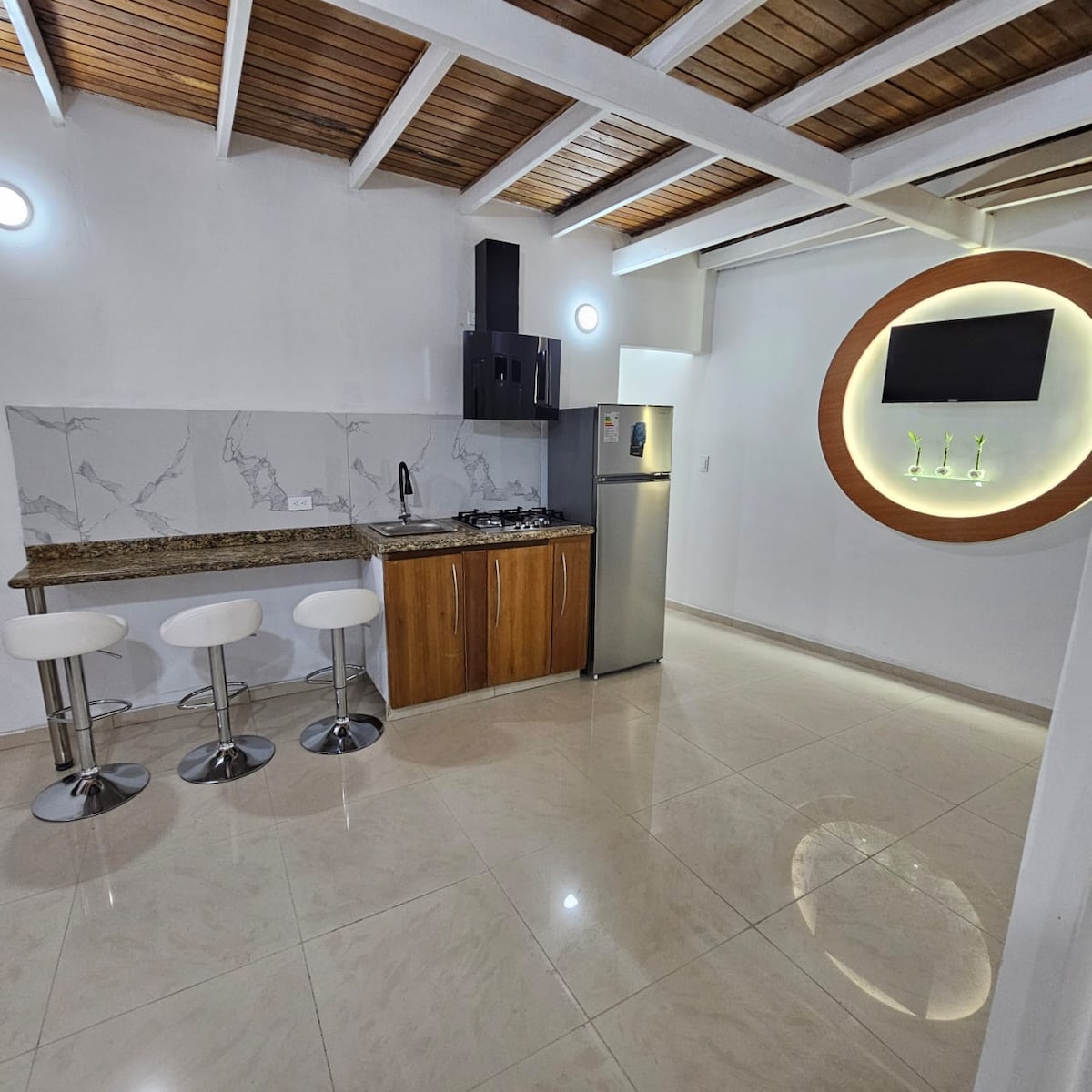 Disfruta de una estadía cómoda y elegante en este hermoso estudio tipo estudio, ideal para parejas o viajeros que buscan un espacio tranquilo, limpio y con estilo. El apartamento cuenta con un diseño abierto que combina sala, cocina y área de descanso, creando un ambiente amplio y funcional. Su techo alto con acabados en madera aporta un toque cálido y moderno, mientras que la iluminación cuidadosamente diseñada crea una atmósfera relajante.