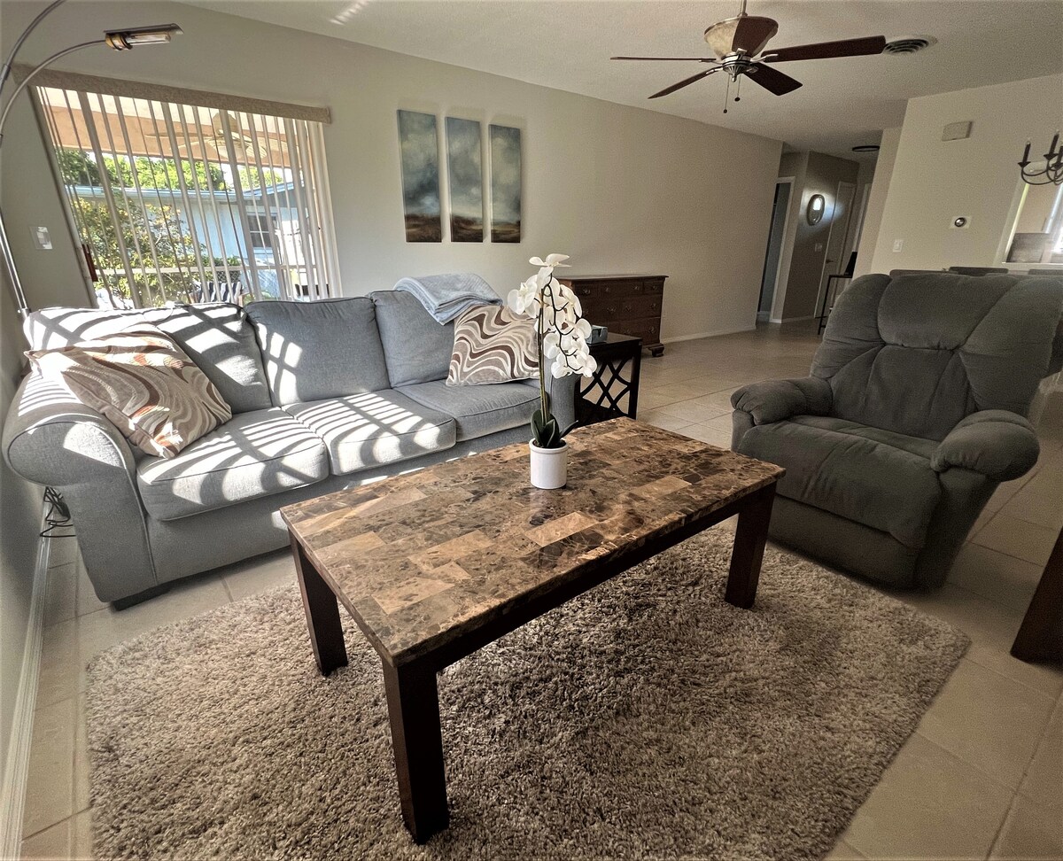 Beliggende i et ønskværdigt samfund i Venice Garden i et roligt kvarter, hvor du ikke kan se, om det er en weekend eller en hverdag. Køkkenet er fuldt udstyret, sengene er utroligt komfortable, den tilbagelænede sofa og to-personers sofa er gode til afslapning. Alt, hvad du har brug for til stranden, er inkluderet i lejen. Den private indhegning i baghaven giver dig mulighed for at overvåge dit kæledyr, mens du nyder en kop kaffe. Nyd en Netflix-gæstekonto og højhastighedsinternet fra XFINITY, der alle er inkluderet i lejen.