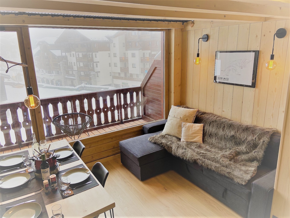 Denne bolig, der er perfekt beliggende i centrum af landsbyen, giver nem adgang til alle bekvemmeligheder. Den består af en master-suite (med badeværelse og toilet), en køjeseng, et badeværelse, et separat toilet, en stue og et åbent køkken. Lejligheden er fuldt udstyret (vaskemaskine, tørretumbler, TV, wifi, Nespresso, opvaskemaskine) og har en stor terrasse, en parkeringsplads, adgang til fitnessrum / sauna / hammam, et privat ski rum.