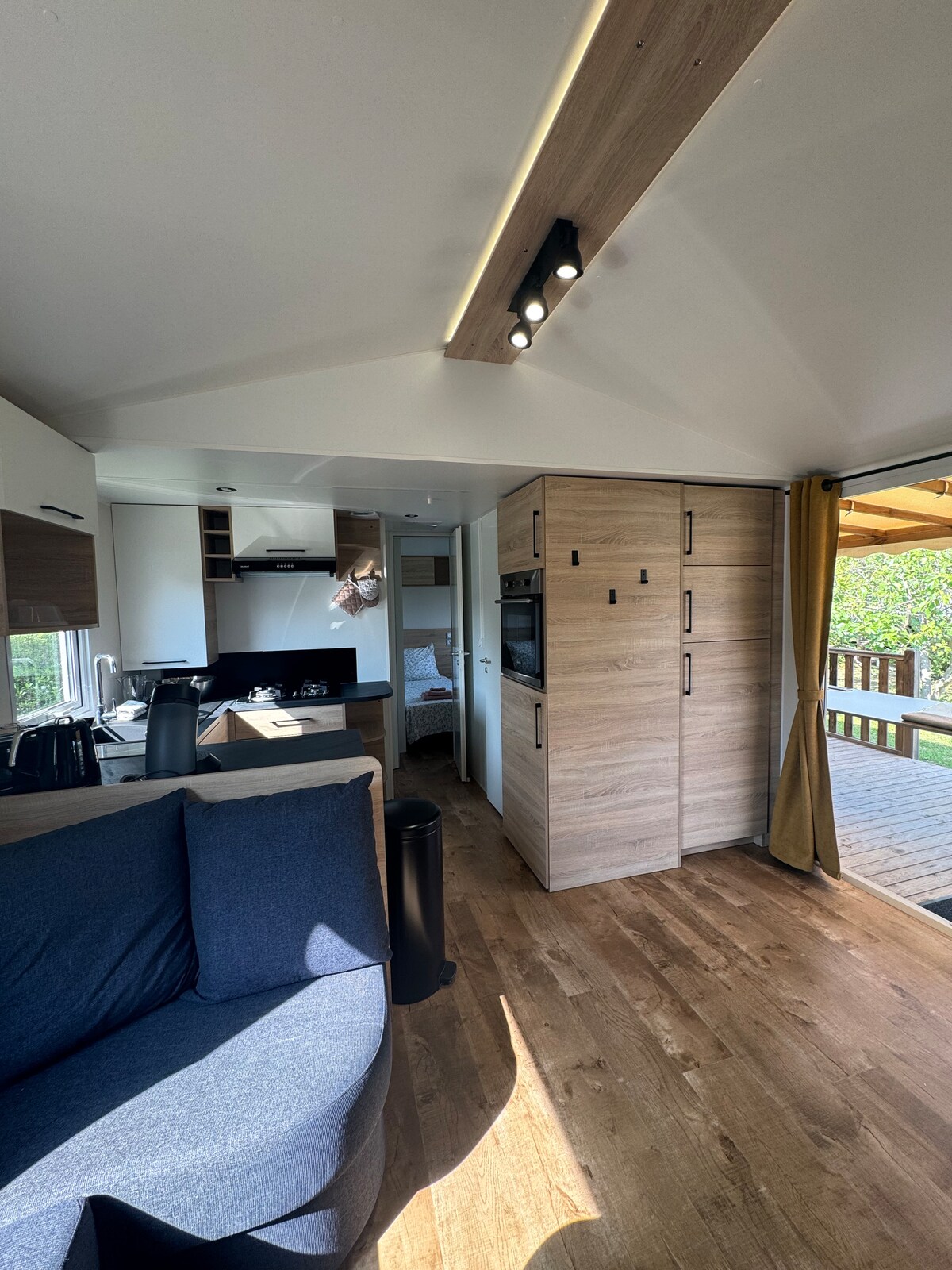 Grand mobile home neuf de 2025, avec wifi, capacité 6 personnes (une chambre parentale, deux chambres avec chacune 2 lits simples), deux salles de bain et 2 wc. Un grand canapé velours marine très confortable vous accueille, un espace repas à l'intérieur et un autre sur la terrasse couverte vous permet d'être dedans/dehors et de profiter de tout l'espace au calme. Les équipements sont de qualité, dans des tons neutres et élégants, avec en prime un superbe jardin paysagé et 2 places de parking.