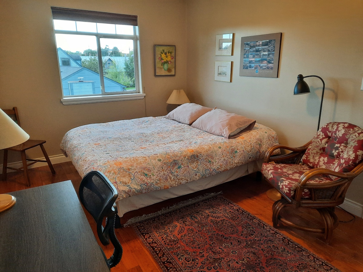 Lyst soveværelse på anden sal med et 4-delt badeværelse og walk-in closet. To enkeltsenge kan bruges separat eller kombineres til en kingsize-dobbeltseng. Puder og madrasser har åndbare, vandtætte betræk. Fælles køkken og spiseplads. 20 minutters gang til Royal Roads University og 2 minutters gang til busstoppesteder. Perfekt til studerende, professionelle eller rejsende!