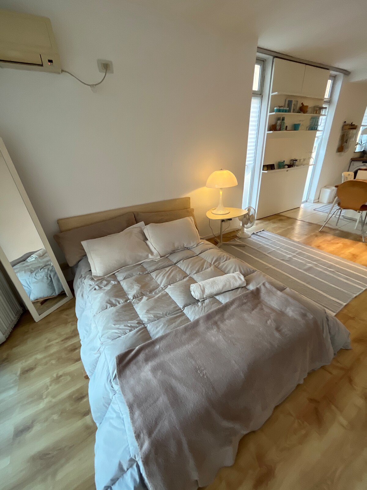 Moderne og lys studiolejlighed. • Privat terrasse med bord og stole • Tagterrasse med grill og solarium • Køkken med alt udstyr: køleskab, mikrobølgeovn, kaffemaskine, elkedel, service • Hurtig WiFi, A/C, Smart TV • Moderne badeværelse med bruser, hårtørrer, shampoo, balsam, sæbe •Dobbeltseng med førsteklasses sengetøj • Støvsuger, strygejern og alle nødvendigheder • Bygningssikkerhed 24/7 Alt er helt nyt!