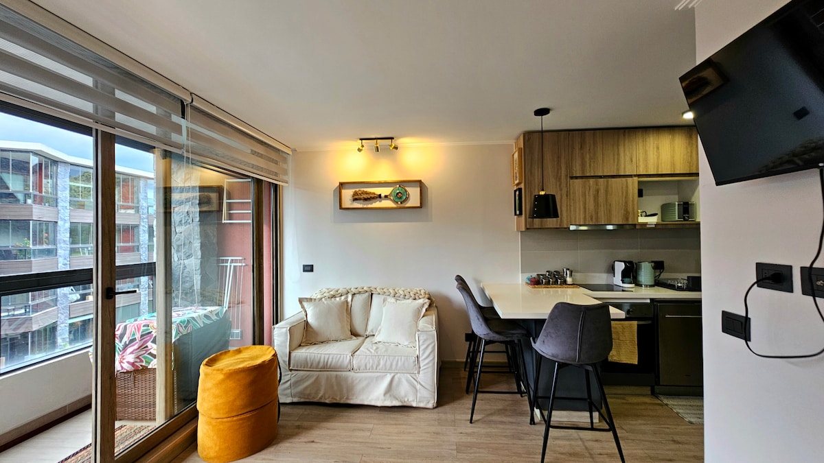 Komfortabel, moderne og hyggelig lejlighed med et soveværelse, tekøkken, dørmand 24 timer i døgnet, parkering, består af aircondition, vaskemaskine, to tv, wifi internet, soveværelse med dobbeltseng, i stuen er der en futon til en person, perfekt til par med børn (ligger på første sal), kapacitet to voksne og to små børn, eller tre voksne, med direkte adgang til terrassen og udstyret køkken. Beliggenhed i forhold til Pucón centrum (5 minutter i bil). Børn under 17 år betaler ikke ekstra.
