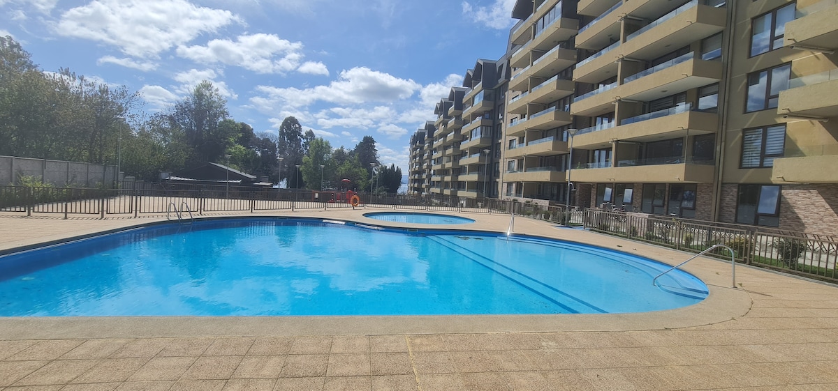Smuk ny lejlighed i en ejerlejlighed, beliggende i rolige naturomgivelser, der er perfekte til at genoplade. Døgnåben sikkerhed. Privat parkering i ejerlejligheden. Udendørs pool til rådighed. Opvarmet pool (25 °C). Tilgængelig fra 1. januar 2026. Ud over dens nærhed til alle de attraktioner, denne vidunderlige region i det sydlige Chile har at tilbyde. Det er en 5 minutters kørsel fra centrum og kun 12 kilometer fra skisportsstedet.