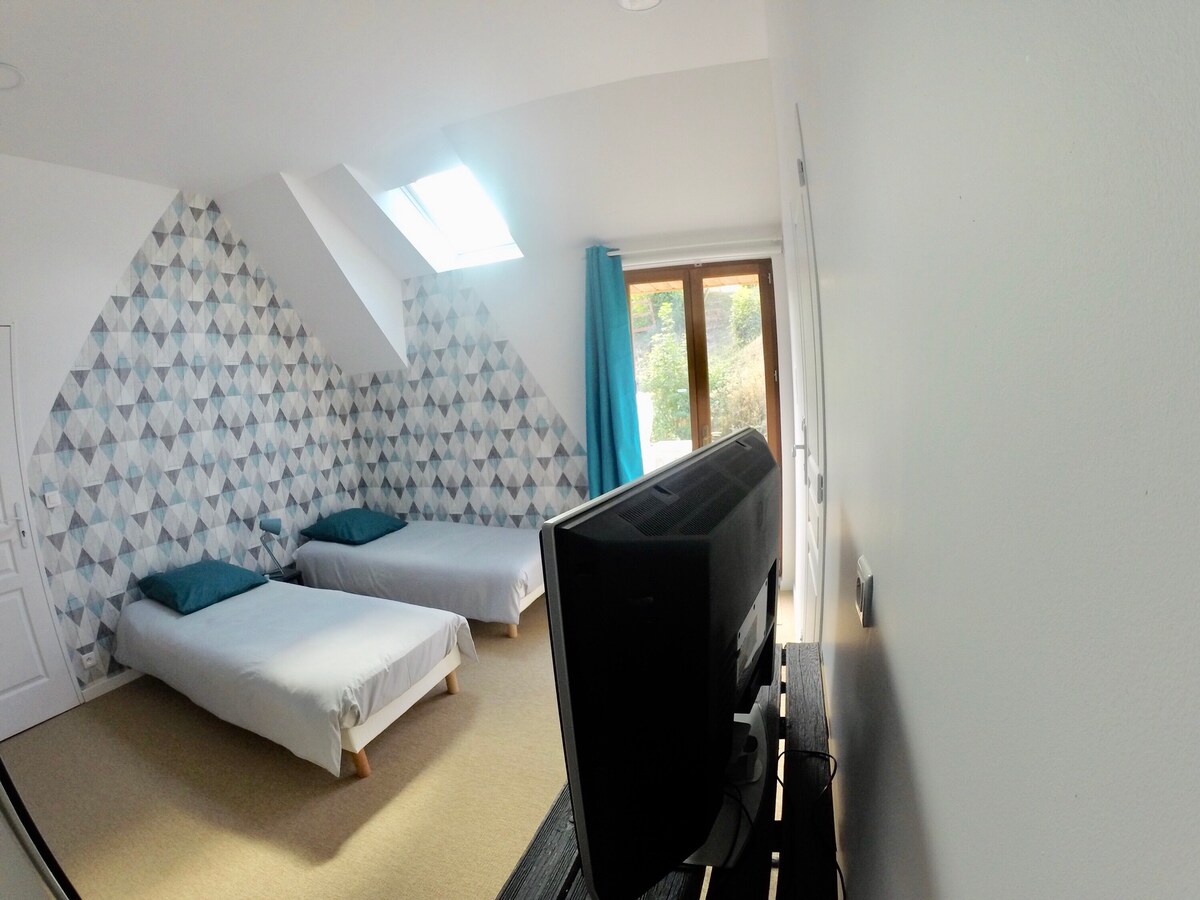 Bolig på 25 m2: soveværelse, køkken, brusebad i et burgundisk hus. og tilstødende terrasse på 10 m2. I grønne omgivelser, 10 minutter fra A19 og centrum af Sens. 7 minutter fra banegården. Tæt på busstoppested, banegård, Sens, Auchan, Gron. To enkeltsenge. Sengelinned og toiletartikler. Ideel til professionelle rejsende eller par på tur! Adgang via en trappe, sti og terrasse beliggende mod syd bag huset. Parkering på ejendommen.