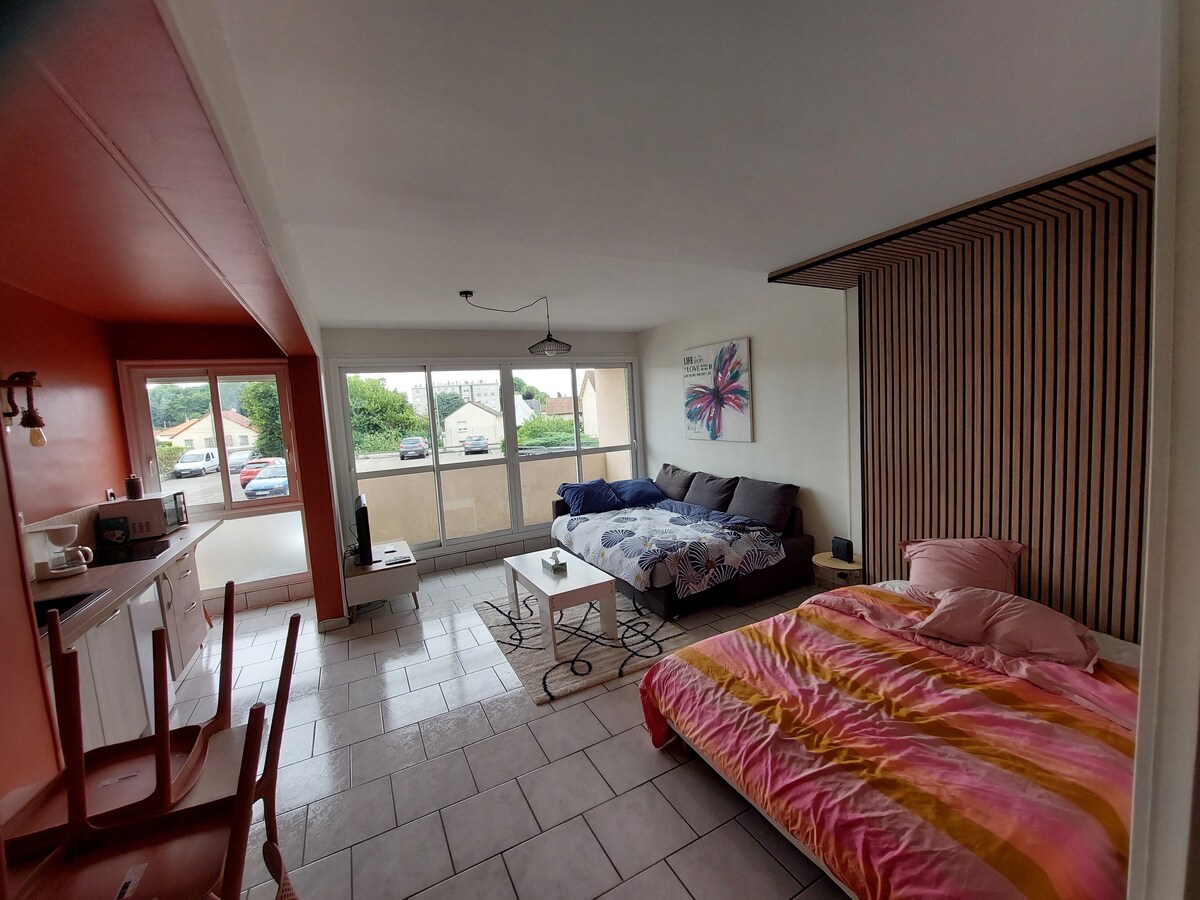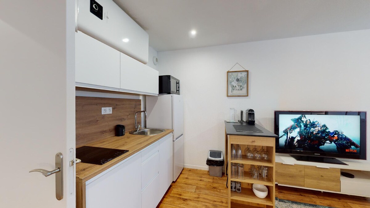 Smuk lejlighed beliggende i centrum af Sens (l'amande) tæt på katedralen, rådhuset, det overdækkede marked og forskellige butikker og restauranter. Du kan nyde dens komplette udstyr med køkkenet åbent til stuen, soveværelset med dobbeltseng og stort skab, badeværelset med bruser og toilet, stuen udstyret med et stort tv med Orange TV og Netflix. Et kontorområde med gratis WI-FI. 1 barneseng og 1 høj stol på anmodning.
