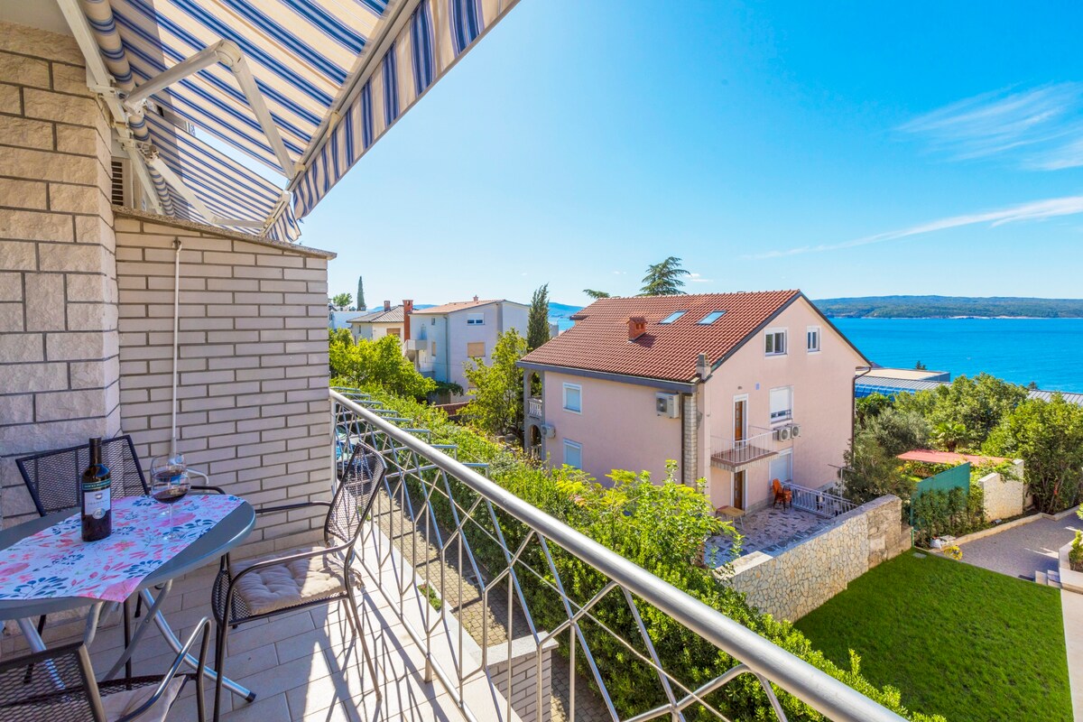 Vores nyrenoverede lejlighed ligger mellem charmerende Crikvenica og Selce og tilbyder alt, hvad du har brug for til en afslappet ferie. Beliggende i et fredeligt familiehus omgivet af frodig middelhavsgrønt, med privat indgang, rummelig terrasse og balkon, smuk havudsigt og kun 2-3 minutters gang til stranden.Det rolige boligområde sikrer total afslapning, mens butikker og restauranter er kun en kort gåtur væk. Ideel til familier, par eller venner, der leder efter et afslappet feriested ved havet