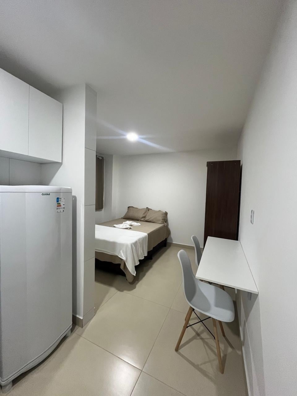 Suite 203, stor, ny og moderne, tilbyder komfort og sikkerhed. Komfortabel queensize-dobbeltseng, sofa med plads til en anden person, aircondition, tv, Wi-Fi, køkken udstyret med minibar, mikrobølgeovn, kaffemaskine, kedel, service og andre ting til at tilberede snacks, små måltider eller drikke en god vin. Den ligger i centrum af Vitória da Conquista og har også en lukket garage med fjernbetjening. Bygning med kameraer og digital lås. Elegant og godt beliggende.